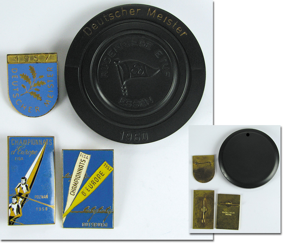 Rowing Championships 1957-1960 Badges + Medal - Three different badges rowing: 1) "Deutscher Meister 1957", gilt bronze, vergoldet, blue enamelled, 4 ,3.4 cm. Was presented to the winer of the German Rowing Championships. 2) Two participation badges from the Euroepean Rowing Championships 1957 and 1958. Gilt bronze, colour enamelld, 5.5 x 3 cm. Plus an winner medal made of briquette "Deutscher Meister 1960", 9 cm in orig case All pieces come from the estate of Günther Kaschlun. Günther Kaschlun (1935-2020; GER) competed at the 1956 Summer Olympics in Melbourne with the men's coxless four where they were eliminated in the semi-final. He was European champion 1957 and came third in the European Championships 1956. He was German champion 1957 and 1960. Condition: