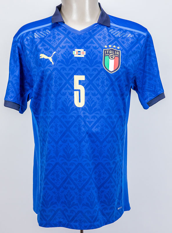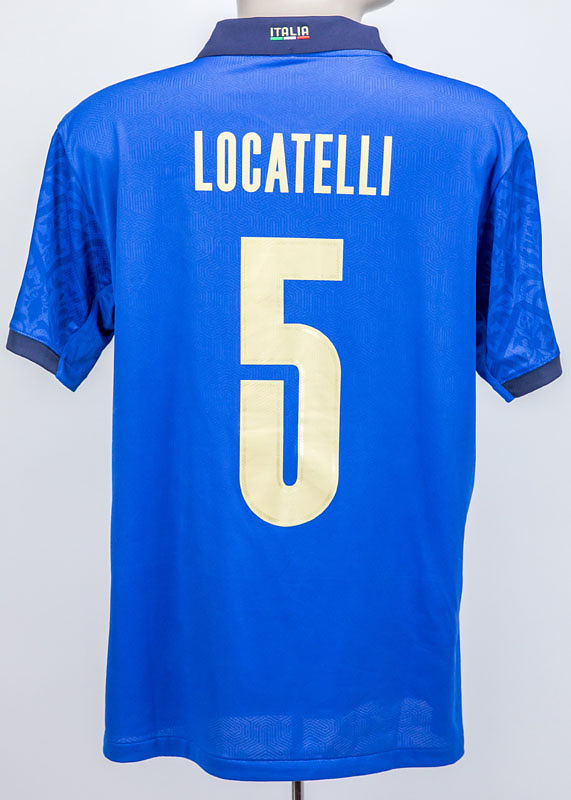 UEFA Euro 2021 match worn football shirt Italia - Original match-worn / issued Italy shirt with the number 5. Worn by Manuel Locatelli on July 11, 2021, in the European Football Championship final against England. Italy - England 1:1, 3:2 on penalties. Barella is the 2021 European Football Champion. Status: AAC --Short-sleeved jersey; size L; rubberized federation logo, 4 World Cup stars, Puma logos, and match details; rubberized player name and number (front and back); laser-engraved ventilation holes; 'Italia' lettering embroidered on the back of the collar; with UEFA European Trophy patch and UEFA Respect patch; Puma DryCell. Condition: A