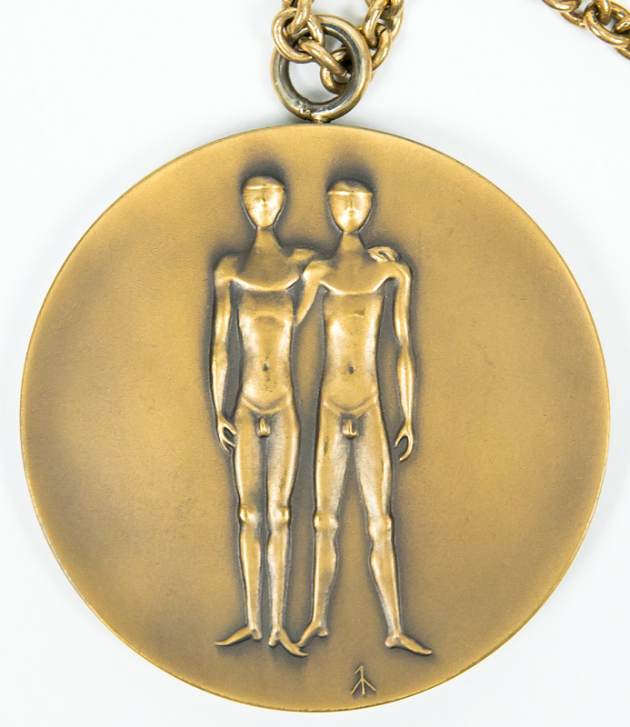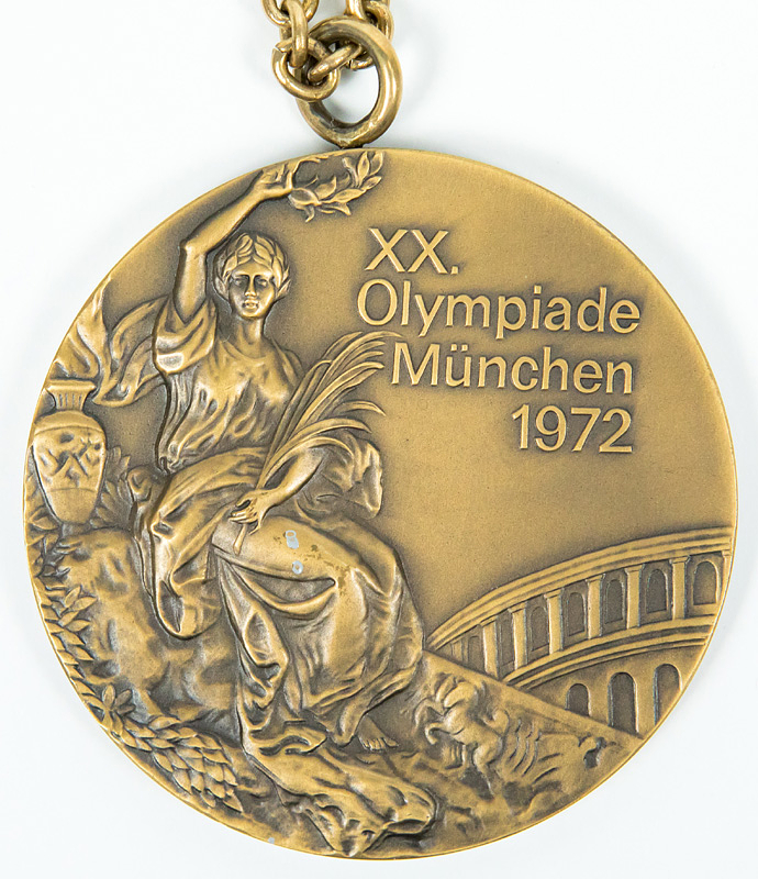 Winner's Medal: Olympic Games 1972 Munich - Bronze medal from the Olympic Games in Munich. "XX Olympiade München 1972" for 3rd place (not awarded), bronze, with chain, size 6.6cm no engraving on the rim of the medal. In original case (17x17x2,8cm) in plastic with printed Olympic emblem. Original cardboard slipcase for case with medal (this however slightly stained). Condition: A