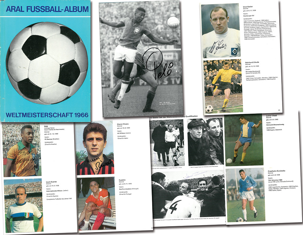 World Cup 1966 Aral Vol 1Cards with 36 autographs - Complete set of cards (36 cards) with 36 original signatures on the cards or in the album from Pele, Eusebio, Bobby Moore and all German players. Size 24x32cm, 53 pages. (GERMAN). --The pictures were inserted into the album using photo corners. Condition: B-